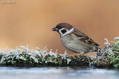 Everything was covered by hoar frost this morning but sunshine could be expected later. So I hoped for some action shots as well. The tree sparrows appeared first at the frozen bathing pool:
